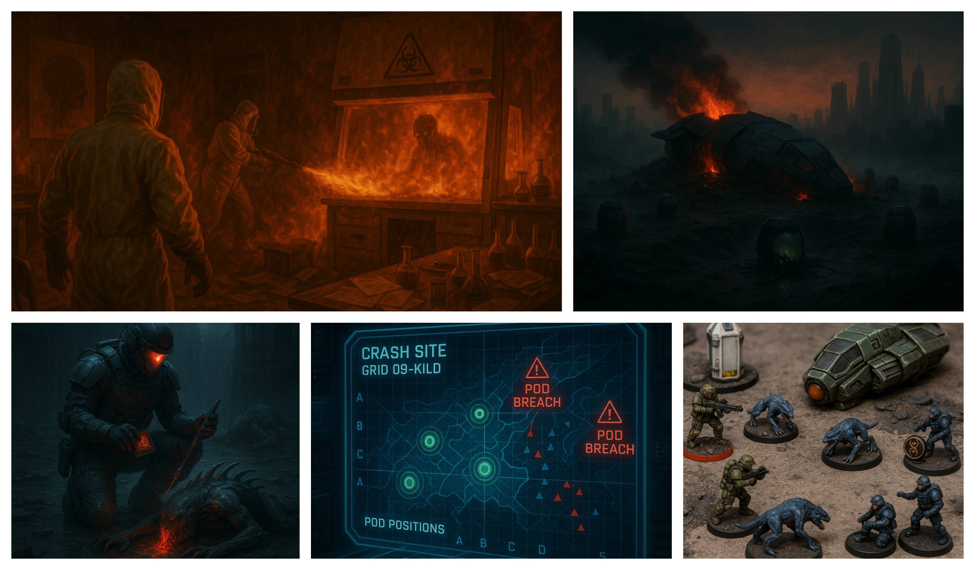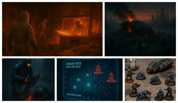 Growth Protocol is a cinematic mission for Grimdark Future: Firefight, where two forces clash over a crashed transport ship carrying unstable Xenophyte specimens. As the alien threat evolves each round, security teams rush to destroy the evidence while a corporate strike team scrambles to extract valuable DNA before it’s too late. Featuring interactive pods, growing hostile creatures, and asymmetric objectives, the mission builds pressure through escalating danger and competing priorities. Designed for narrative play with any two OPR armies.